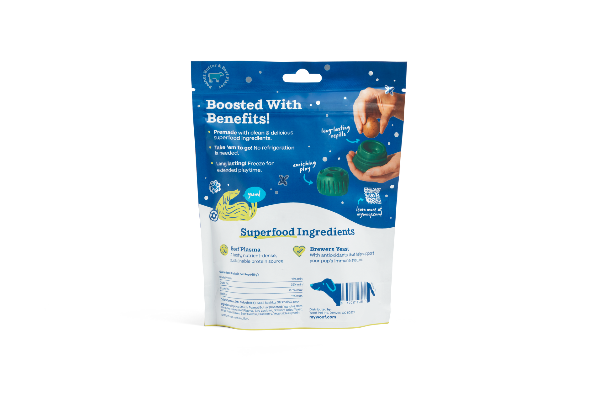 Ingredients: Tapioca Starch, Peanut Butter (Roasted Peanuts), Date Syrup, Beef Tallow, Beef Plasma, Soy Lecithin, Brewers Dried Yeast, Dried Coconut Flakes, Beef Gelatin, Blueberry, Vegetable Glycerin.