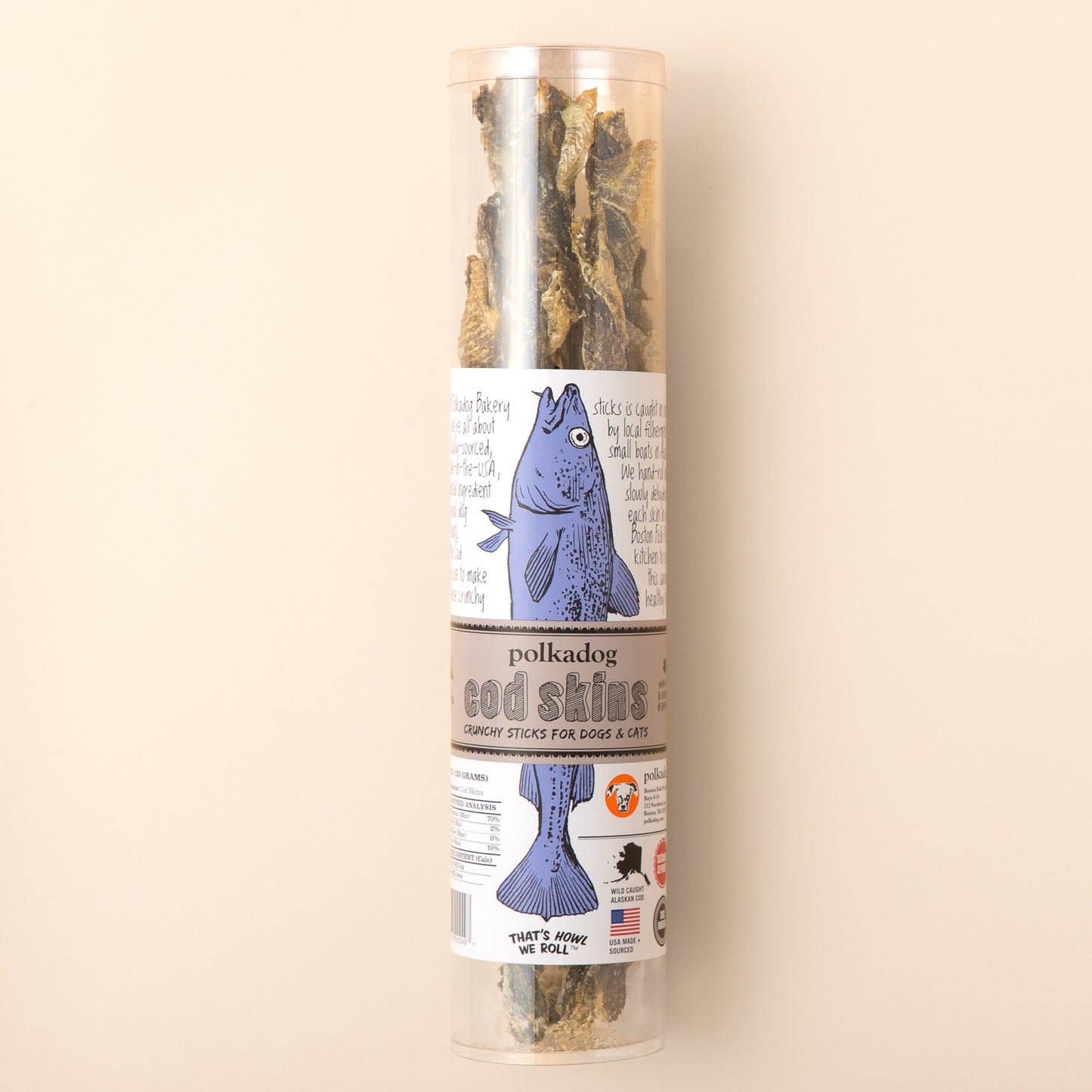 At Polkadog, we're all about locally sourced, made-in-the-USA, limited ingredient natural dog treats. Our super-duper fish skin dog treats are no exception. The cod we use to make these cod skins for dogs is caught wild in season by fishermen on small boats in Alaska. We hand-roll and slowly dehydrate each skin in our Boston kitchen to create these crunchy, savory, healthy cod skin treats.